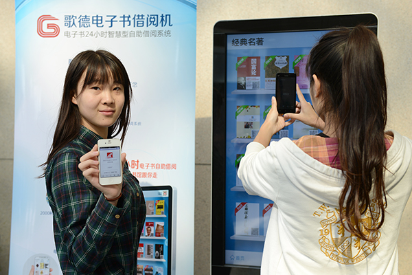 近日,記者看到我校圖書館大廳看到了一部“大手機”,不少讀者拿手機在屏幕上翻閱掃描