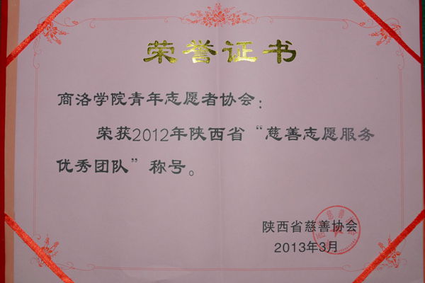 3月3日,陜西省慈善協(xié)會(huì)下發(fā)了《關(guān)于表彰2012年慈善志愿服務(wù)優(yōu)秀團(tuán)隊(duì)、慈善志愿服務(wù)先進(jìn)個(gè)人“一元關(guān)愛(ài)”先進(jìn)單位的決定》,我院青年志愿者協(xié)會(huì)榮獲“慈善志愿服務(wù)優(yōu)秀團(tuán)隊(duì)”稱號(hào)。3月12日,商洛市慈善協(xié)會(huì)下發(fā)了《關(guān)于表彰2012年度慈善明星企業(yè)和慈善工作先進(jìn)集體的決定》,并授予我院團(tuán)委“慈善志愿服務(wù)活動(dòng)先進(jìn)集體”稱號(hào)。